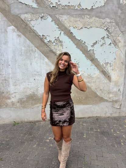 Skirt met all-over pailletten in glanzend bruin. Een echte eyecatcher voor feestjes en avonden uit.