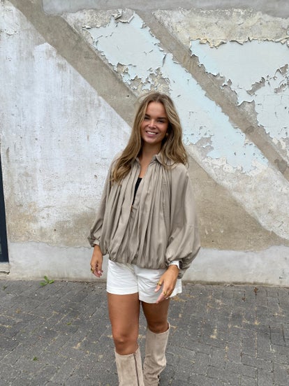 Jacket/ blouse in een satijnachtige beige stof met lange, wijde mouwen en een losse fit. De soepele stof valt elegant en geeft je outfit direct een chique, effortless look. Een echte musthave voor een trendy garderobe