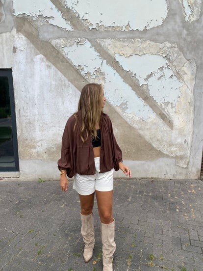 Jacket/ blouse in een satijnachtige bruine stof met lange, wijde mouwen en een losse fit. De soepele stof valt elegant en geeft je outfit direct een chique, effortless look. Een echte musthave voor een trendy garderobe