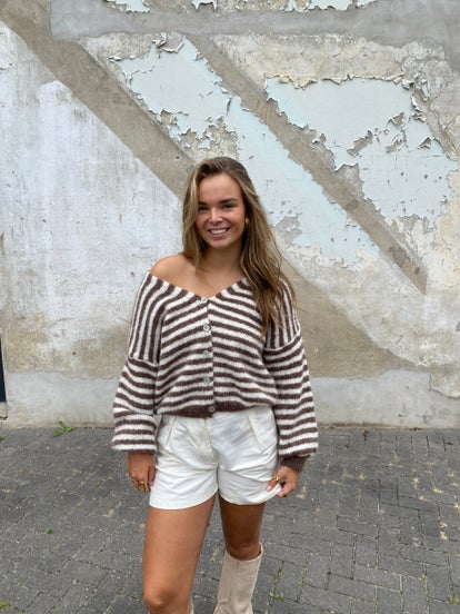 Zachte gebreide knit met bruine en beige strepen. knoopsluiting en een comfortabele, iets oversized pasvorm. Een musthave knit die zowel in het voorjaar als najaar heerlijk te dragen is.