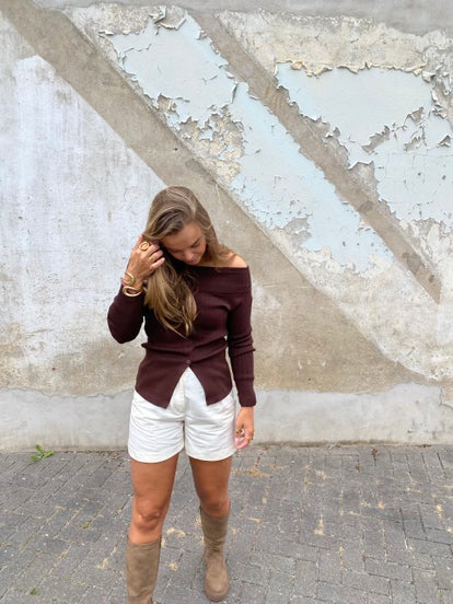 Bruine ribgebreide top met off-shoulder detail en knoopsluiting. Stijlvol en vrouwelijk, perfect voor zowel casual als chique combinaties.