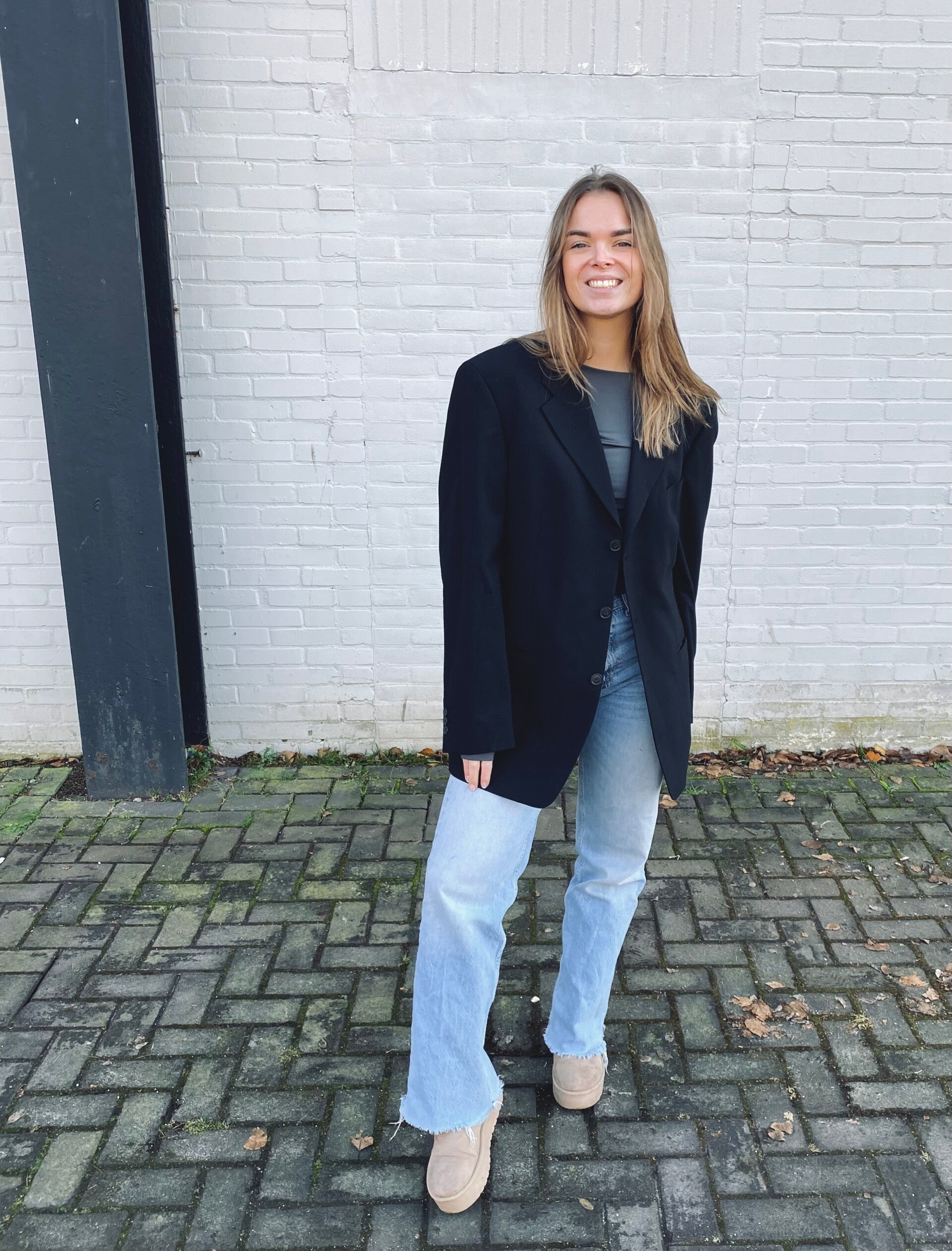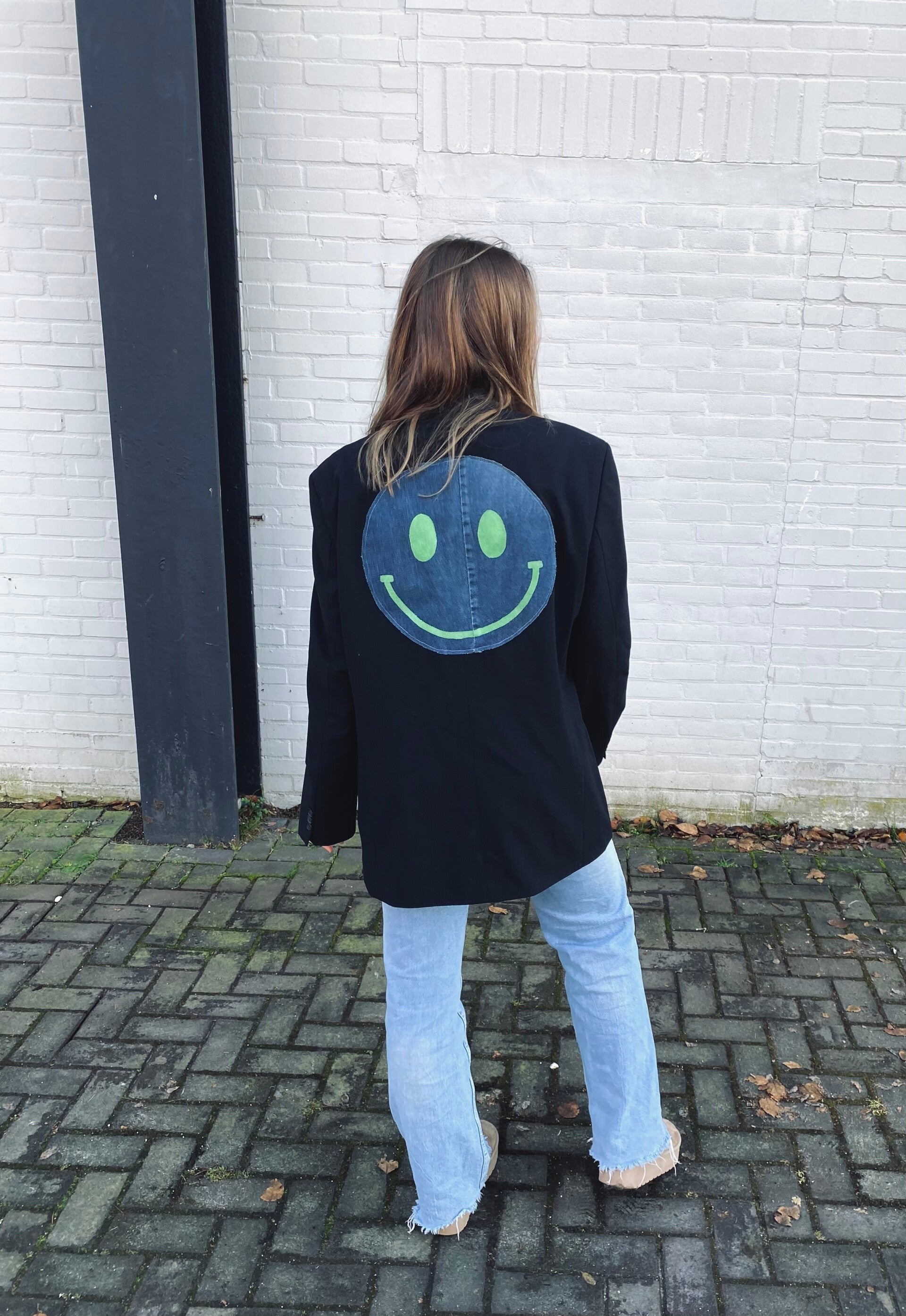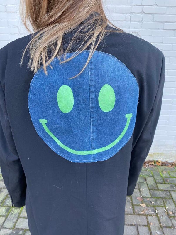 Vintage blazer bleu met back print gemaakt van oude jeans met groene details