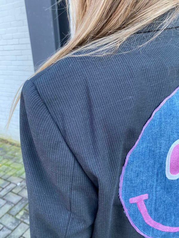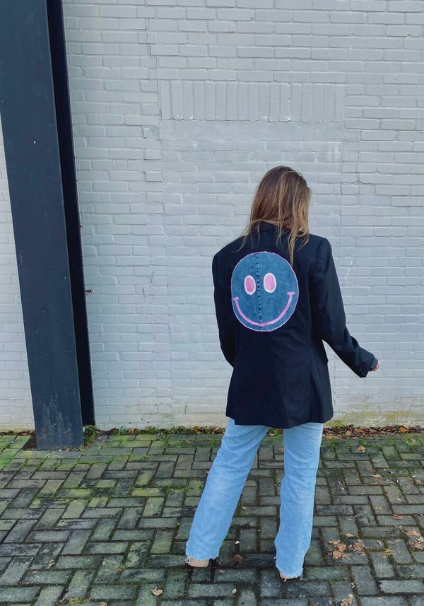 Vintage blazer black met back print gemaakt van oude jeans met roze details