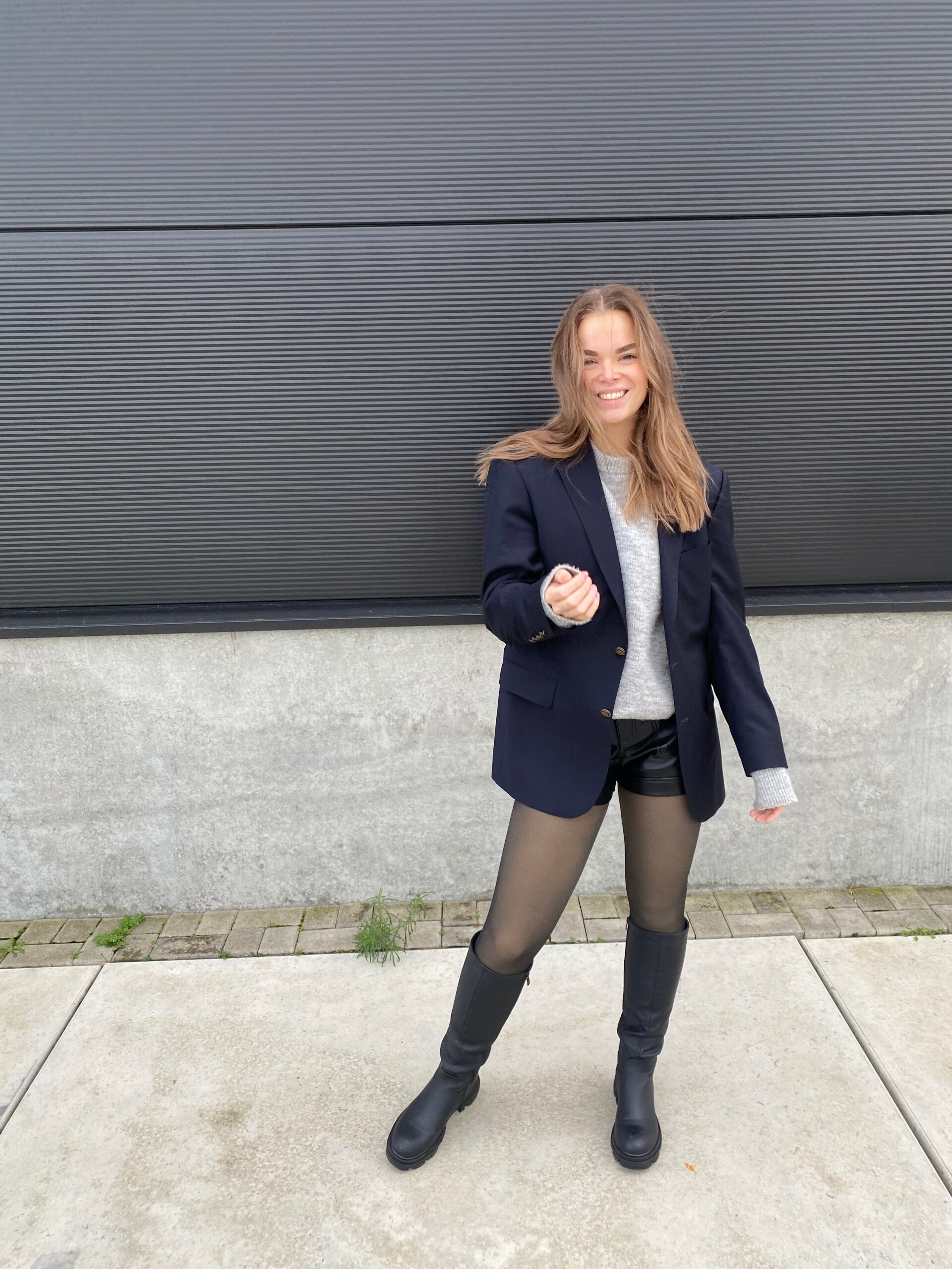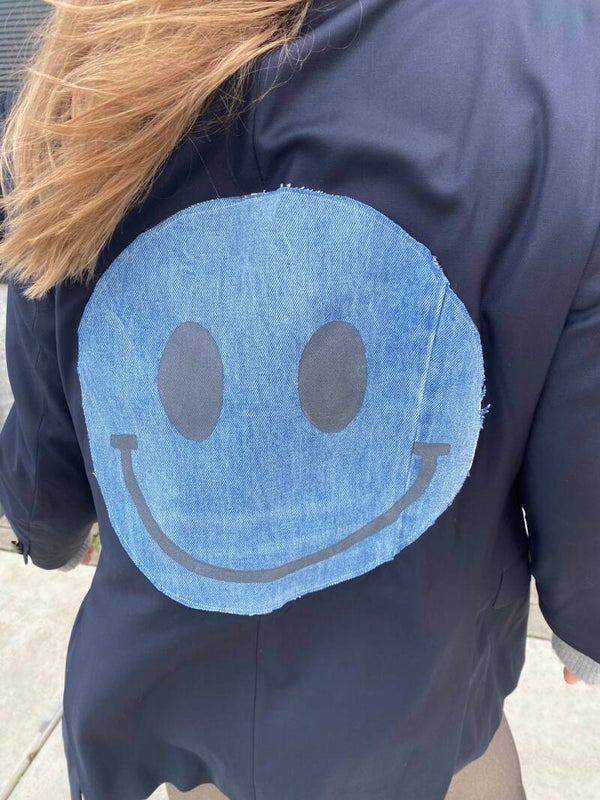 Vintage blazer blue met een back print gemaakt van oude jeans met zwarte details
