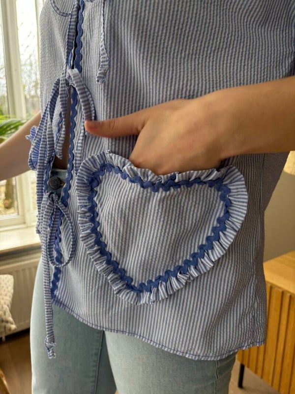 * One size* Blue * Cotton * Blauw hart op voorpand * 3 strikken* Poofy mouwen