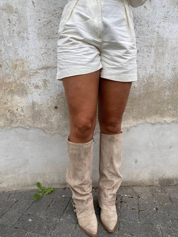 Beige suède knielaarzen met een nonchalante slouchy look, gesps detail en handige ritssluiting. Perfect voor een city chic outfit.