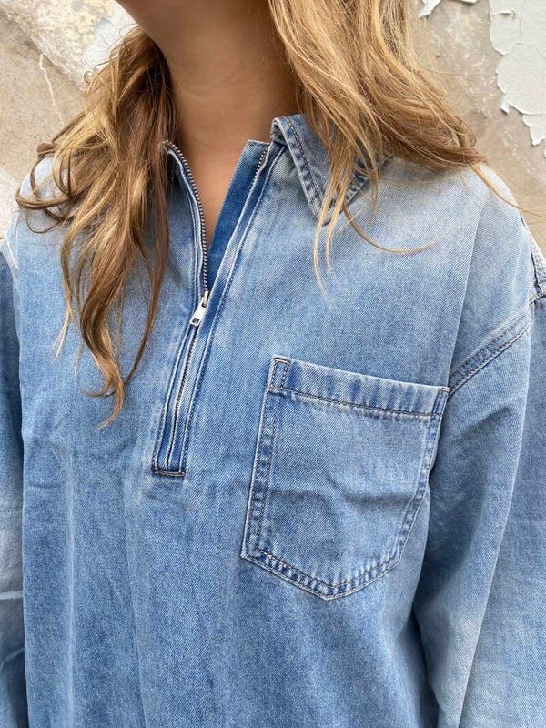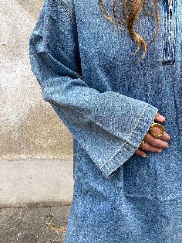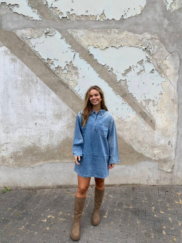 Deze oversized spijkerjurk heeft een relaxte pasvorm, een halve rits en een borstzakje voor een stoere touch. Perfect te dragen met laarzen of sneakers – ideaal voor een casual maar stijlvolle look.