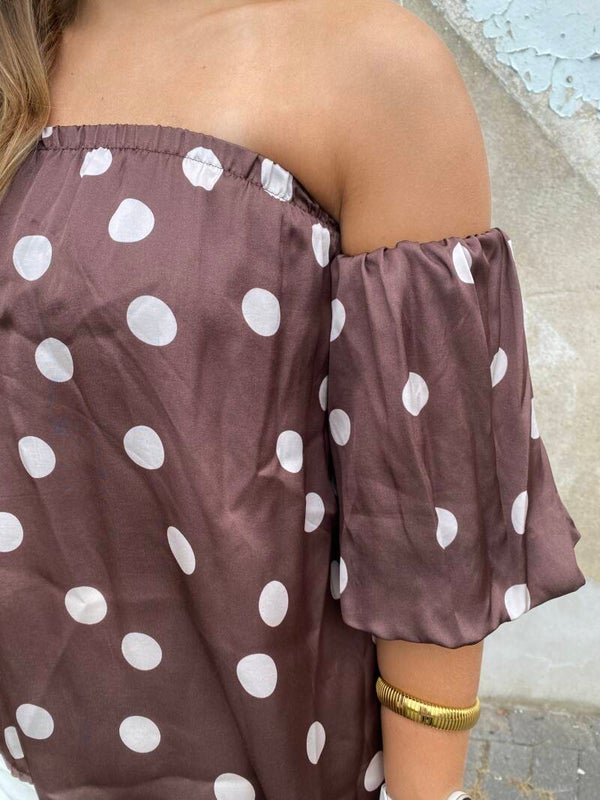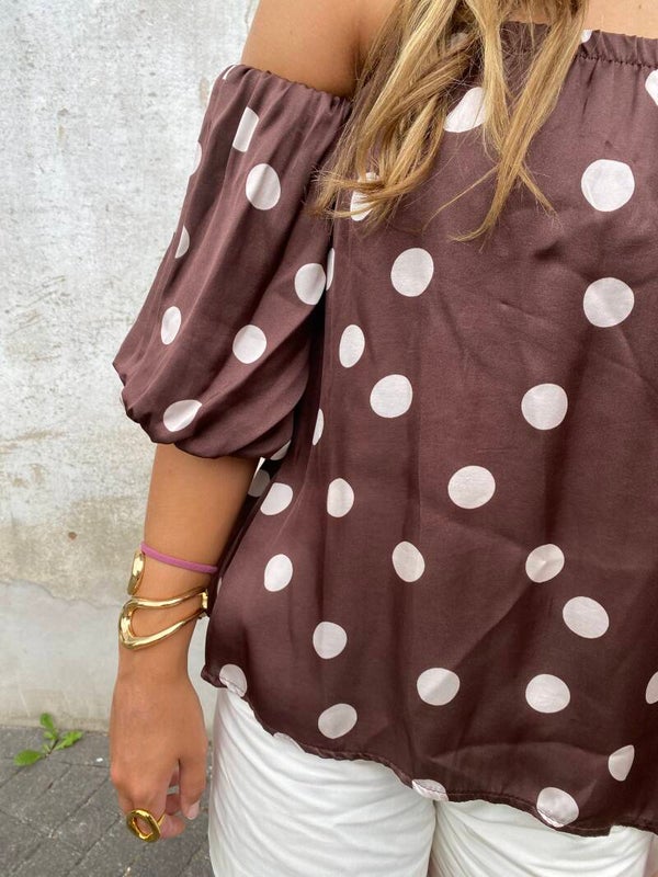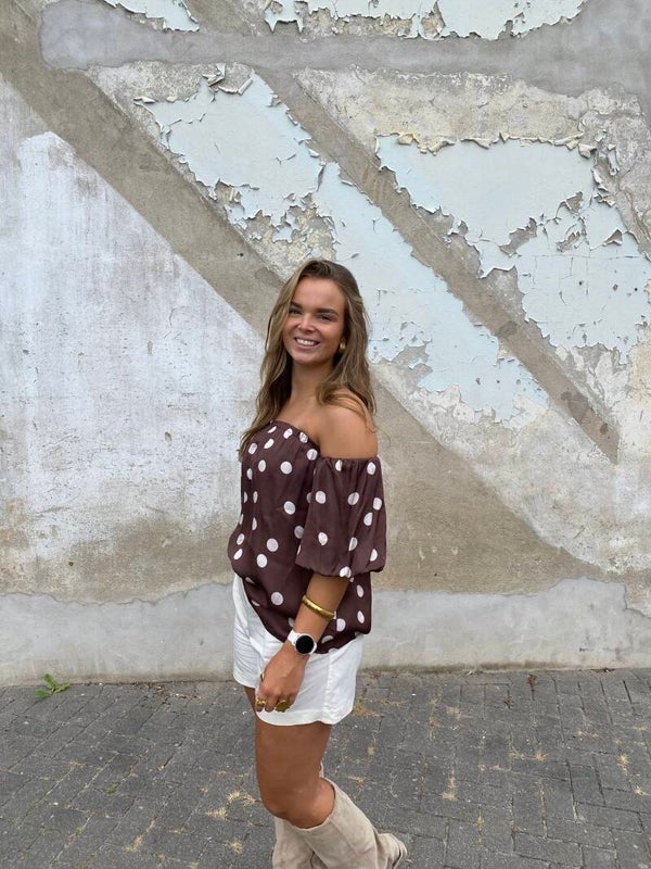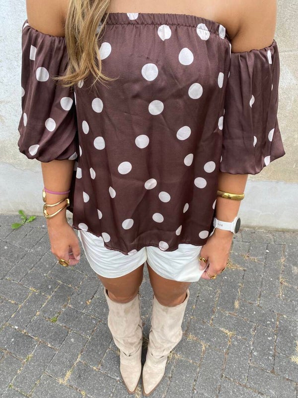 Deze off-shoulder top met speelse polkadots is een echte blikvanger! De luchtige stof en de pofmouwen geven hem een vrouwelijke en trendy uitstraling.