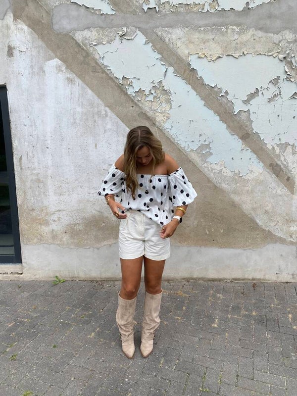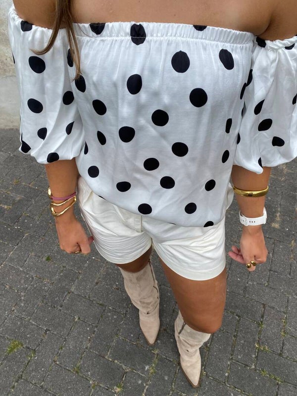 Deze off-shoulder top met speelse polkadots is een echte blikvanger! De luchtige stof en de pofmouwen geven hem een vrouwelijke en trendy uitstraling.