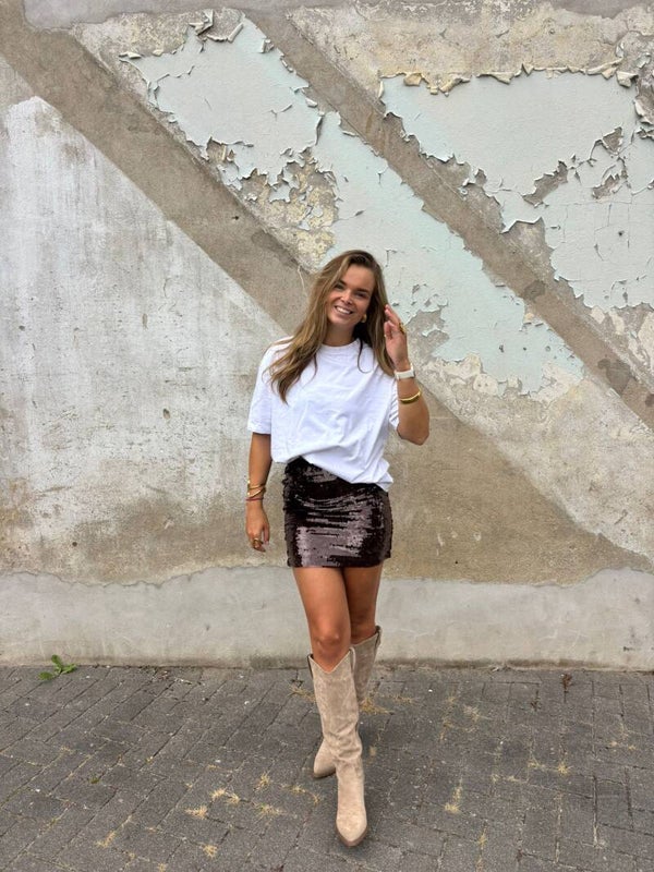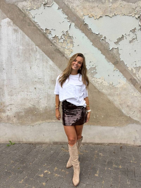 Skirt met all-over pailletten in glanzend bruin. Een echte eyecatcher voor feestjes en avonden uit.