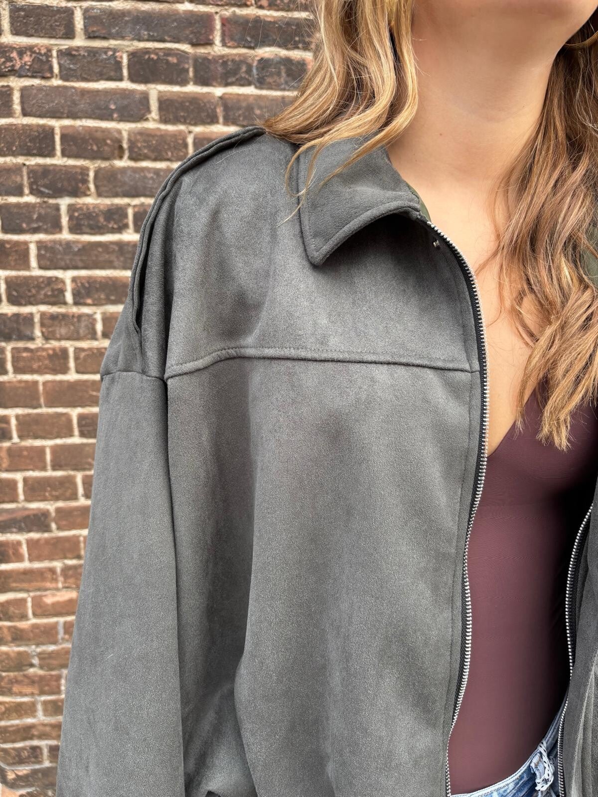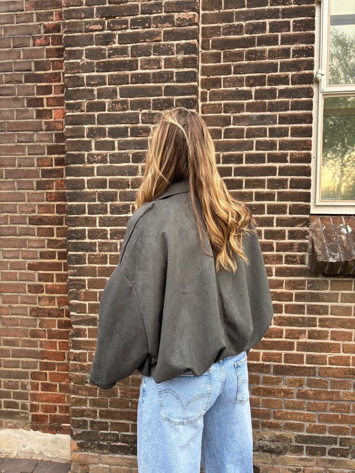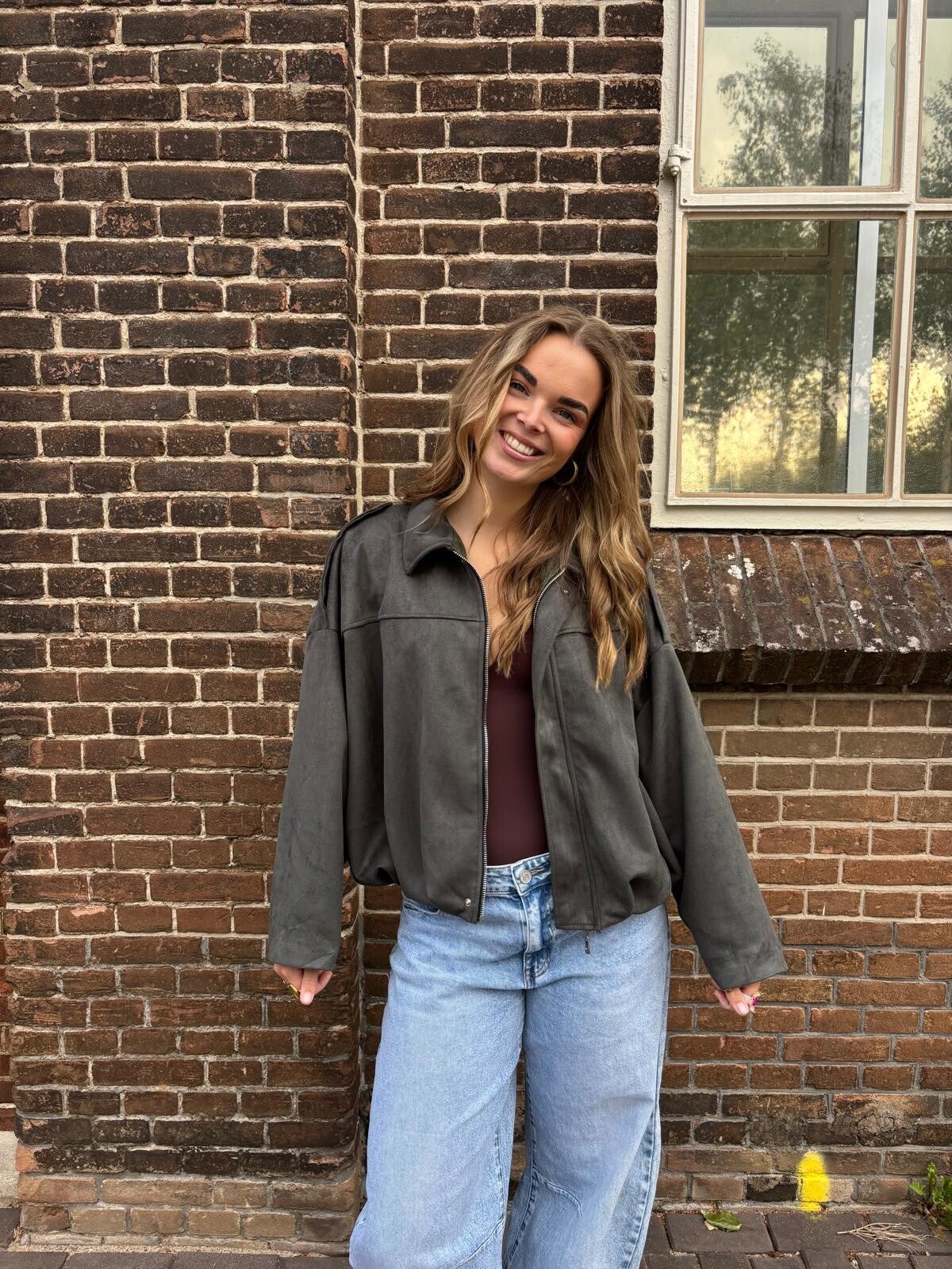 Trendy oversized bomber in de kleur green Gemaakt van een soepelvallende suede look met een stoere rits en wijde mouwen voor een nonchalante look. Perfect te combineren met jeans, een basic top of jurkje. Draag ‘m casual overdag of als stijlvolle layering in de avond.