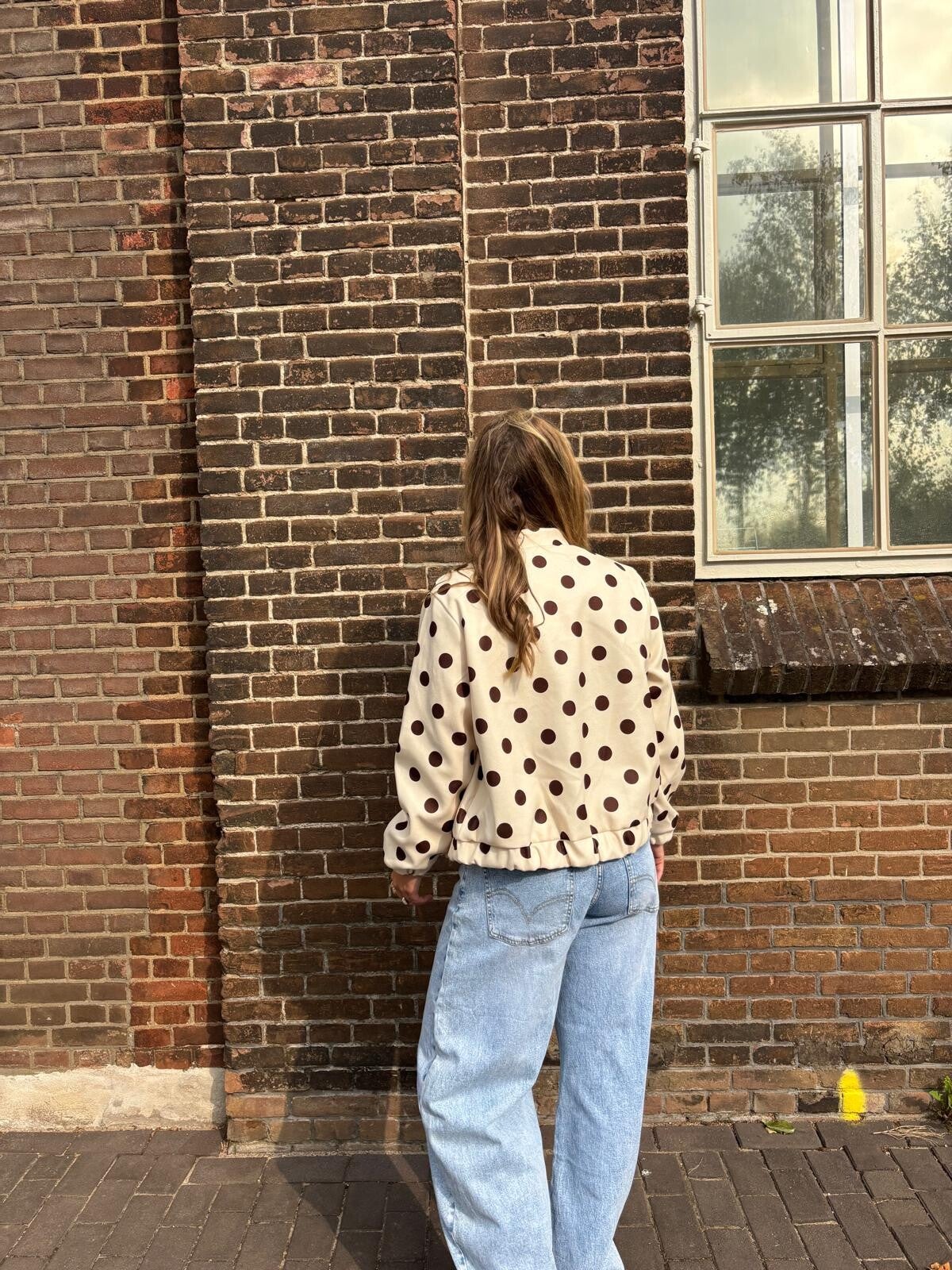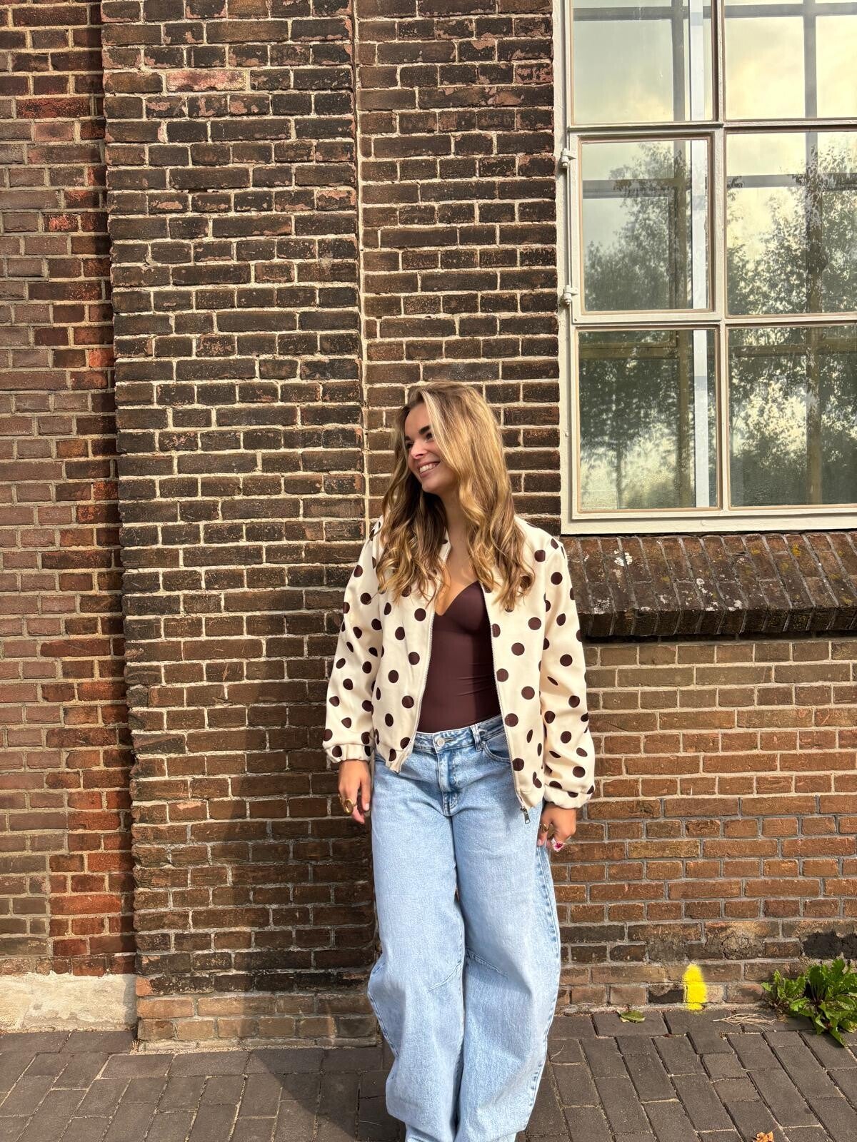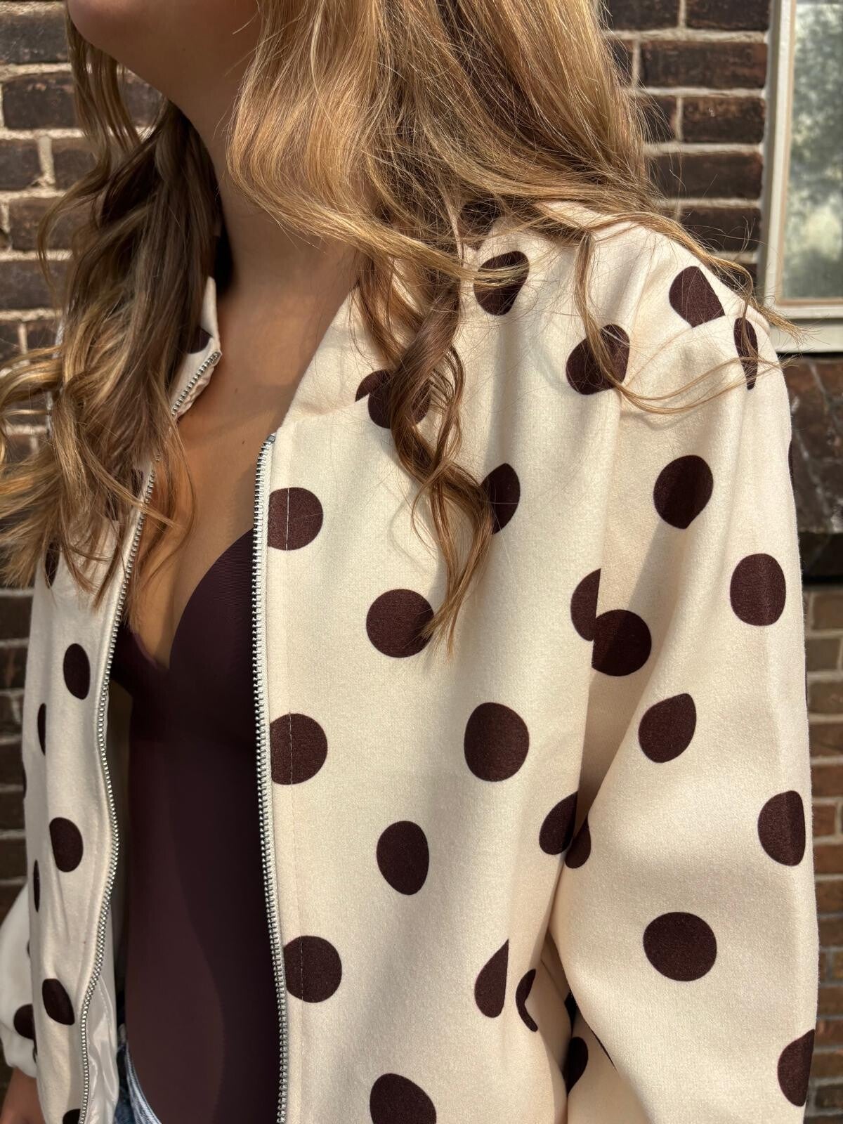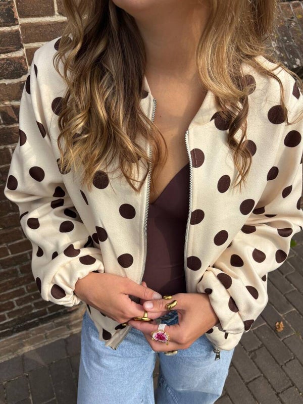 Maak een statement met dit speelse polka dot bomber jasje in beige met donkerbruine stippen. Het jasje heeft een relaxte fit, elastische boorden en een rits aan de voorkant.