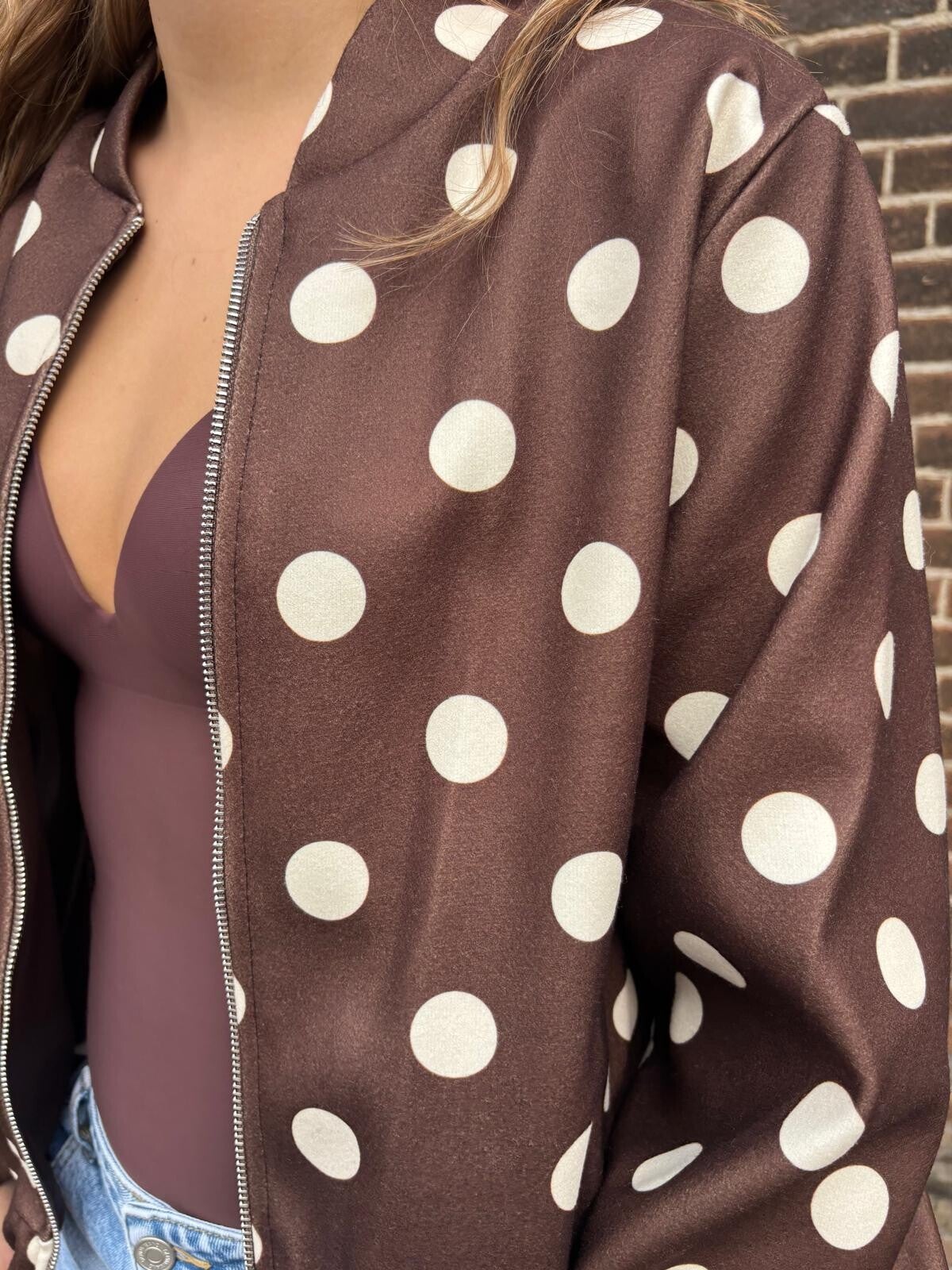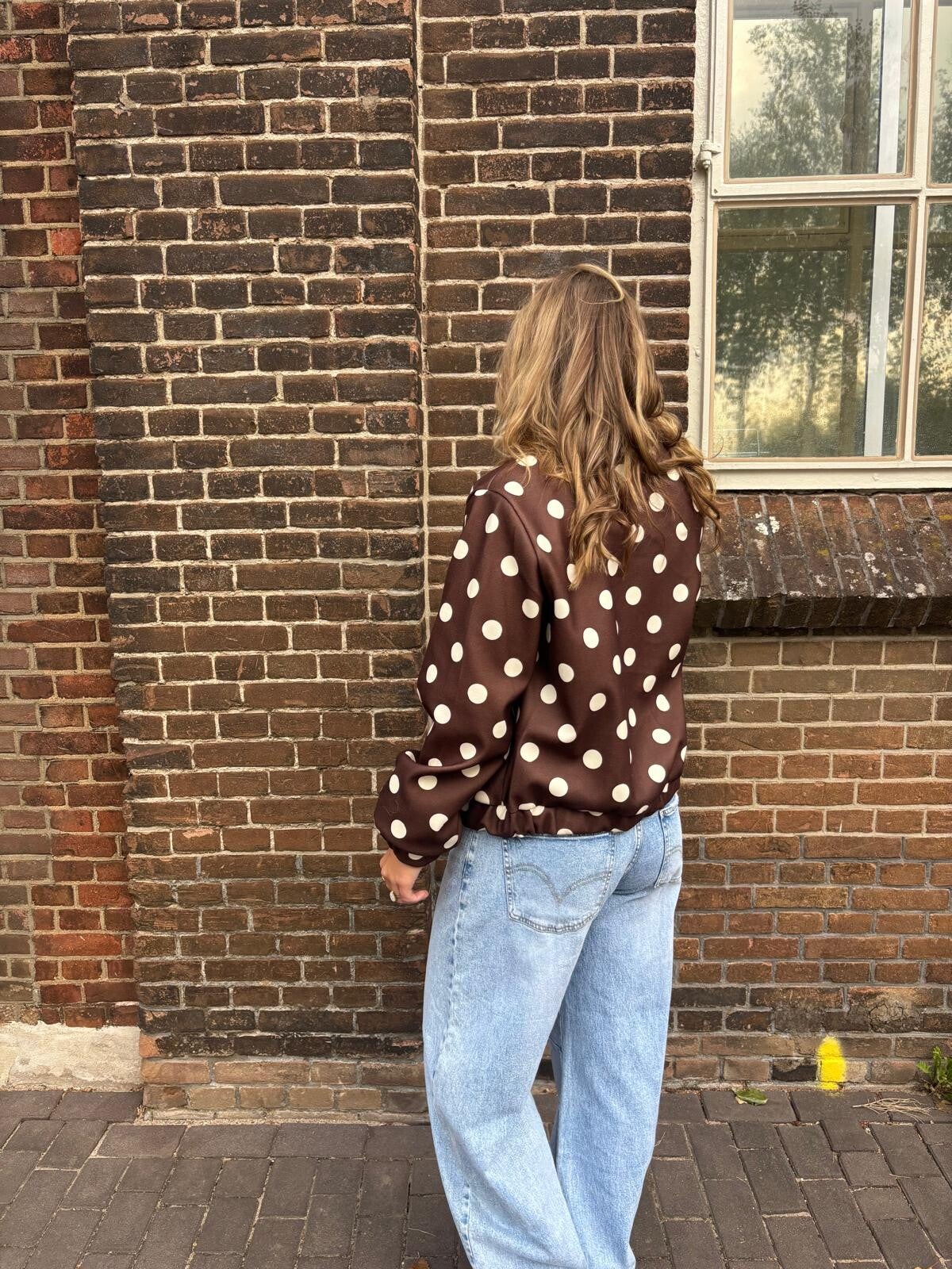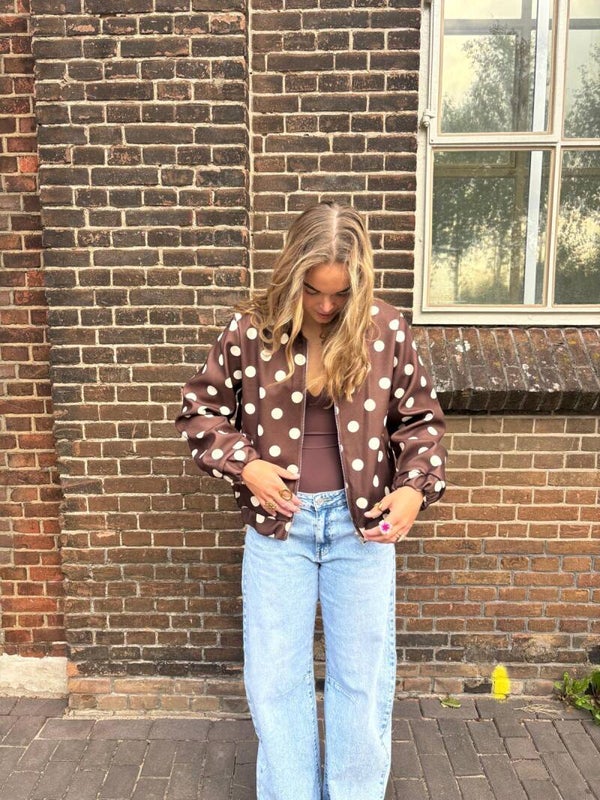 Maak een statement met dit speelse polka dot bomber jasje in bruin met beige stippen. Het jasje heeft een relaxte fit, elastische boorden en een rits aan de voorkant.