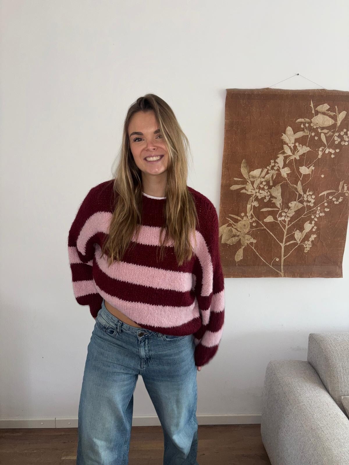 Zachte, gebreide sweater met brede strepen in bordeaux en lichtroze