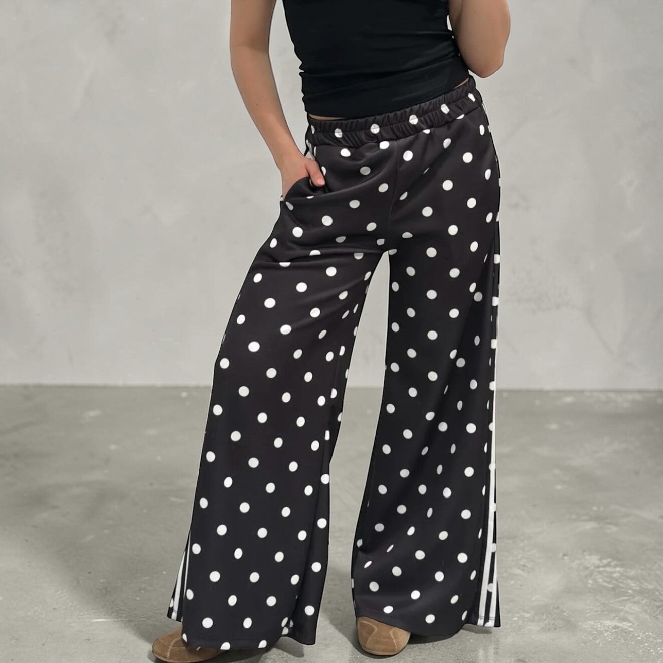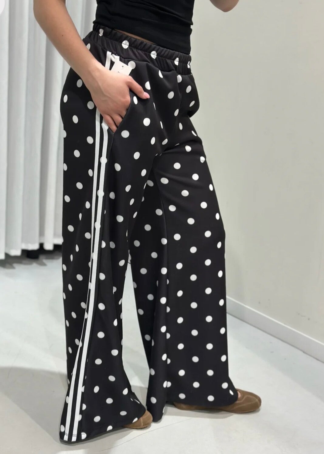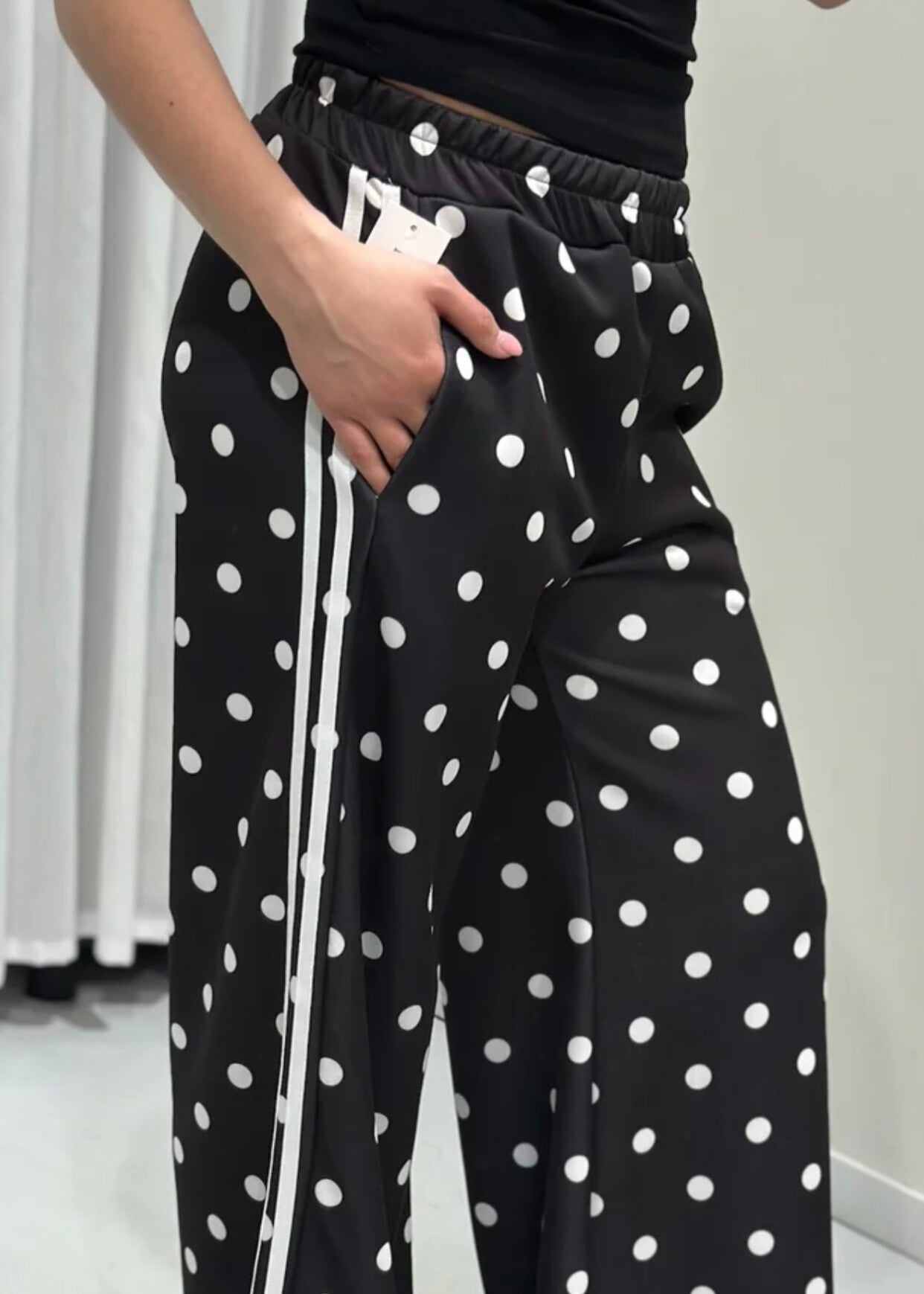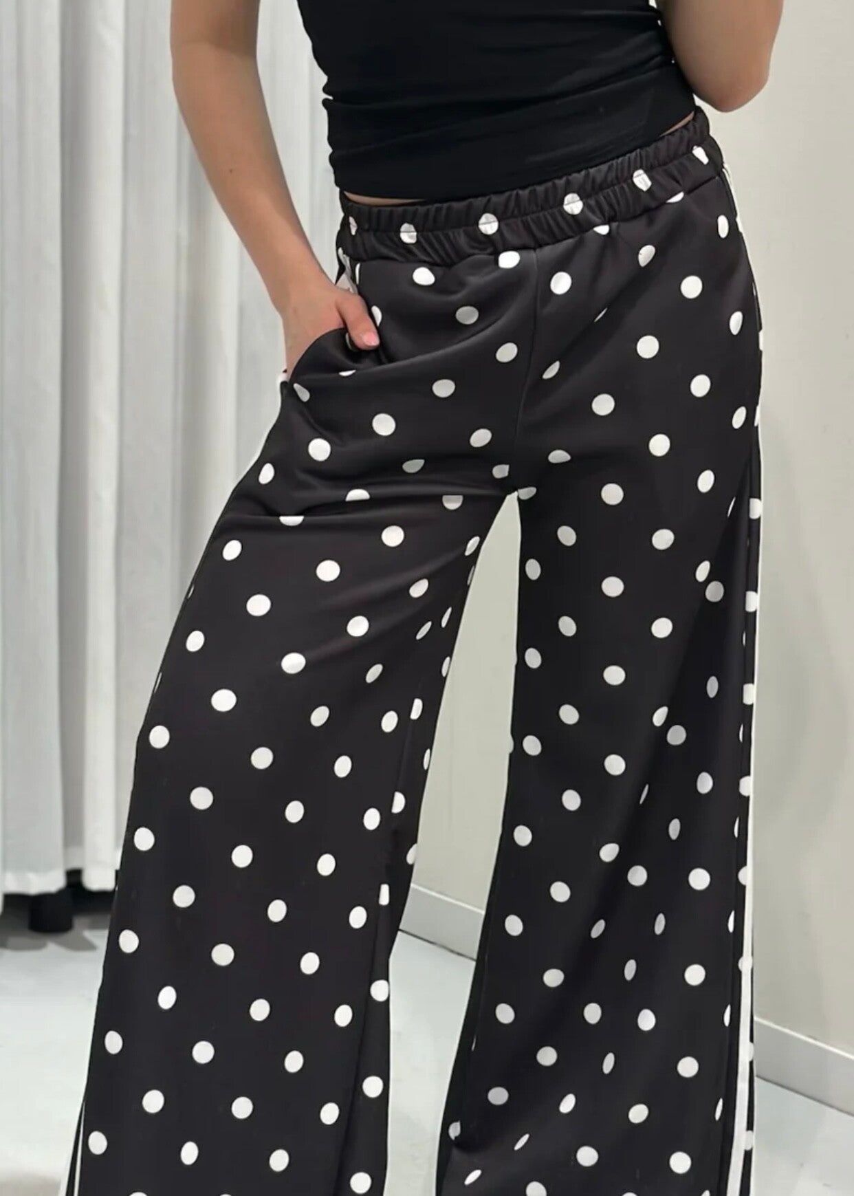 Speelse wide leg broek met witte stippen, elastische taille en zwarte bies langs de zijkant. Zit heerlijk en geeft elke outfit een trendy touch.