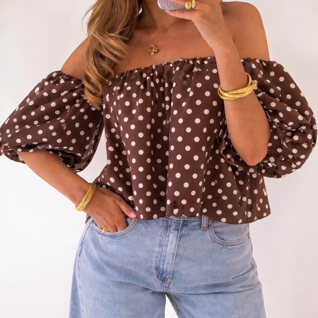 Off shoulder polkadot top met pofmouwen. Stijlvol, vrouwelijk en perfect om eindeloos te combineren.