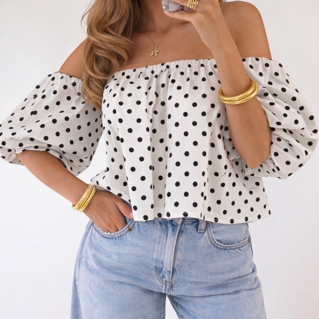 Off shoulder polkadot top met pofmouwen. Stijlvol, vrouwelijk en perfect om eindeloos te combineren.