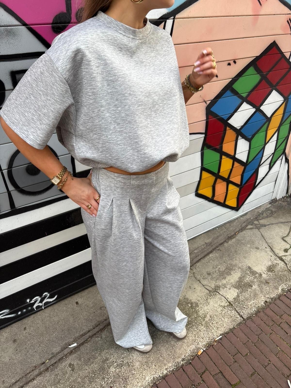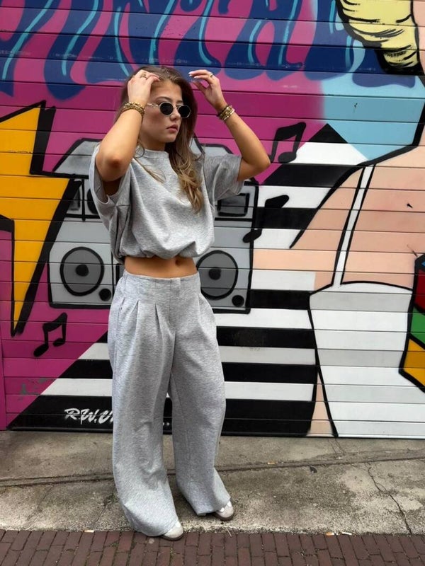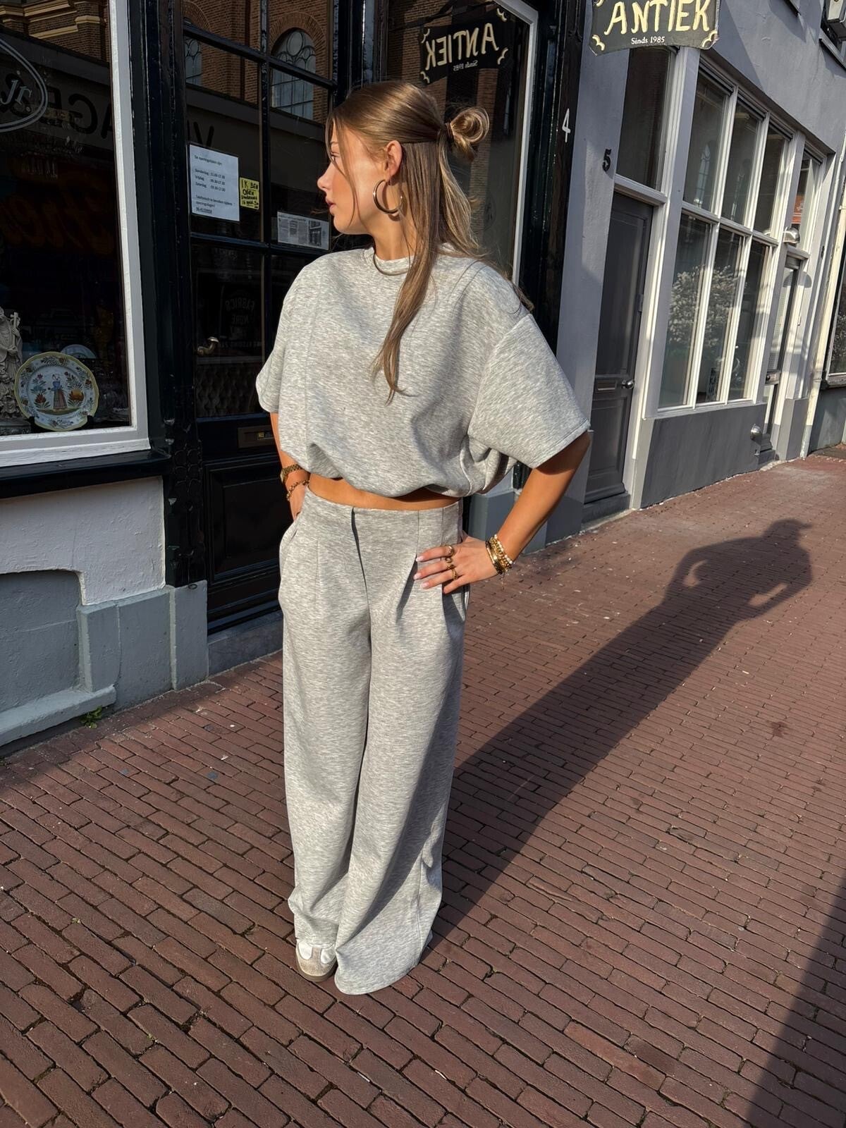 Zacht grijs setje met cropped top en wide leg broek. Comfortabel, stijlvol en perfect voor een effortless everyday look.