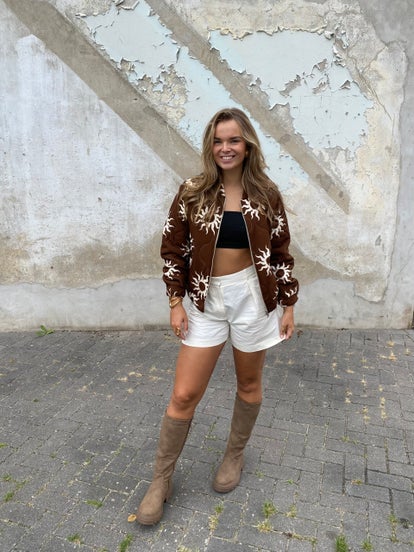 Trendy bomber jacket in coffee bruin met opvallende off White details. Dit jasje geeft elke outfit een edgy en stijlvolle touch.